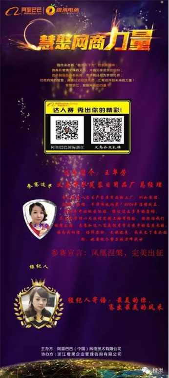 橙果电商在阿里巴巴官方授权下协助举办本次浙江网商达人赛,通过演讲的方式选拔有勇气、有激情、有梦想的电商达人,旨在汇聚电商思想,展现电商风采,打造电商达人,凝聚电商力量。为了更好地参与支持本次活动,橙果电商的6位股东成员:星星果李爱兰、糯米果王翠芳、莲花果周和仙、人参果方孝强、百花果刘微、火龙果陈涧堂也参与了本次达人赛的竞选。