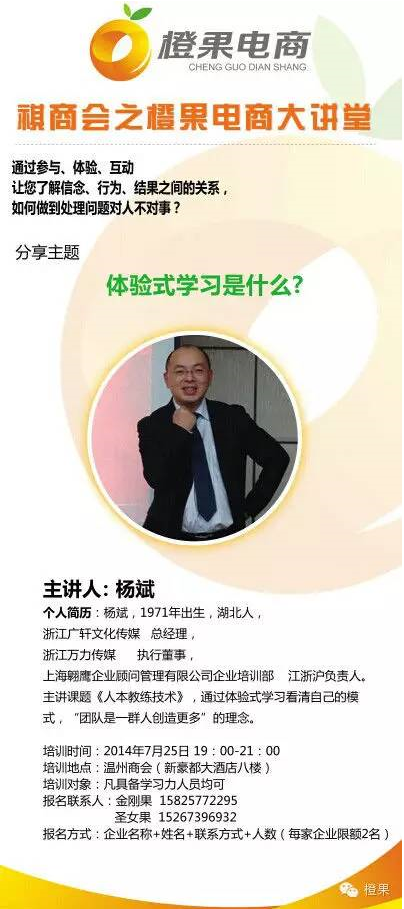 橙果电商荣幸邀请到国家高级企业教练师--杨斌老师于本周五(7月25日)与大家作精彩的互动分享学习,让您通过参与、体验、互动,了解到信念、行为、结果之间的关系,如何做到处理问题对人不对事。