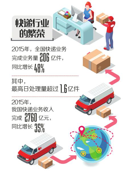 近年来,随着电商快速发展,带来了快递行业的繁荣。据中国快递协会发布的数据显示,2015年,全国快递业务完成业务量206亿件,同比增长48%。其中,最高日处理量超过1.6亿件。2015年,我国快递业务收入完成2760亿元,同比增长35%。