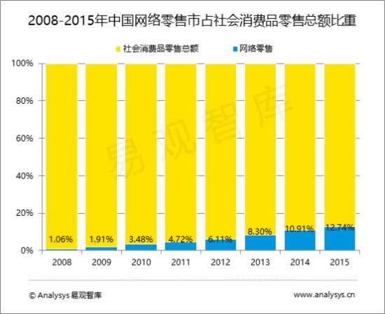目前中国网络零售已成为国民经济的重要组成部分,2015年全年,中国网络零售占社会消费品零售总额的比重达到12.74%,并呈现持续较快增长的势头,Analysys易观智库分析认为,2016年网络零售市场仍将呈现较快速增长,主要有如下几个方面的因素带动: