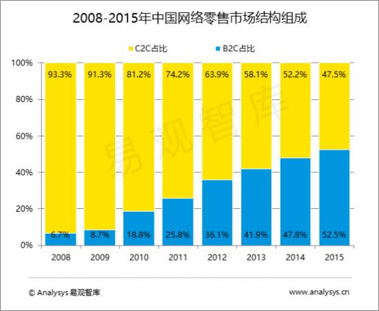 2015年,中国网络零售B2C占比首次超越C2C,网络零售B2C占比达到52.5%。网络零售B2C的崛起,说明中国网络零售已进入规模化竞争的阶段。随着越来越多大型的规模化网商进入网络零售市场,个人卖家在激烈的竞争中逐渐被淘汰。Analysys易观智库分析认为,未来网络零售B2C的占比还将进一步提升,但在大量非标品类上,仍将活跃大量个人卖家。