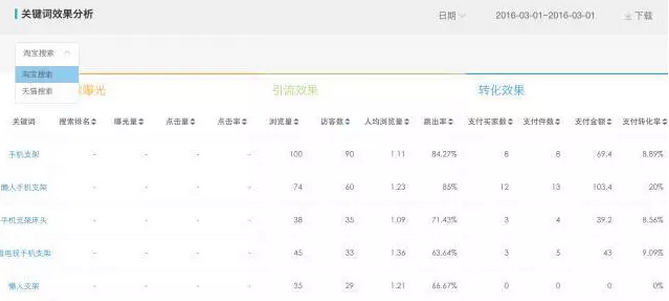 这里面数据分pc和无线,建议以无线为主。关键词里分一部分淘宝搜索,还有一部分天猫搜索,默认按照浏览量排序。为防止遗漏,写完按照支付买家数看一下有没有搜索不大但是成交不错的关键词。