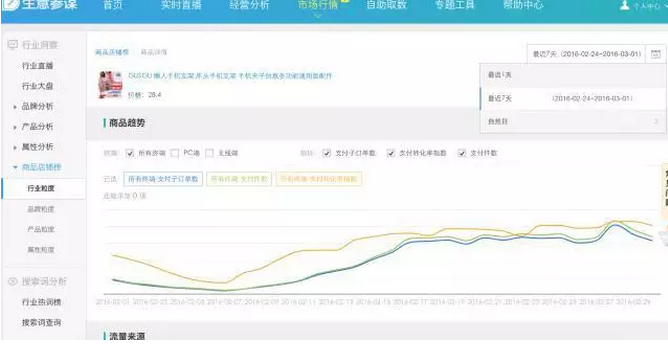 在生意参谋的市场行情,左边有个商品店铺榜,点开行业粒度,会给你展示昨天或者过去7天平均销售最好的单品。点击后面的查看详情,就可以看到对手产品的流量结构和引流成交关键词。