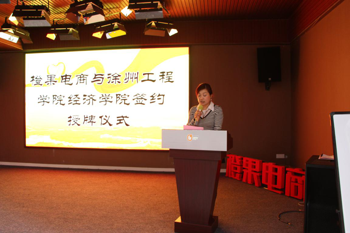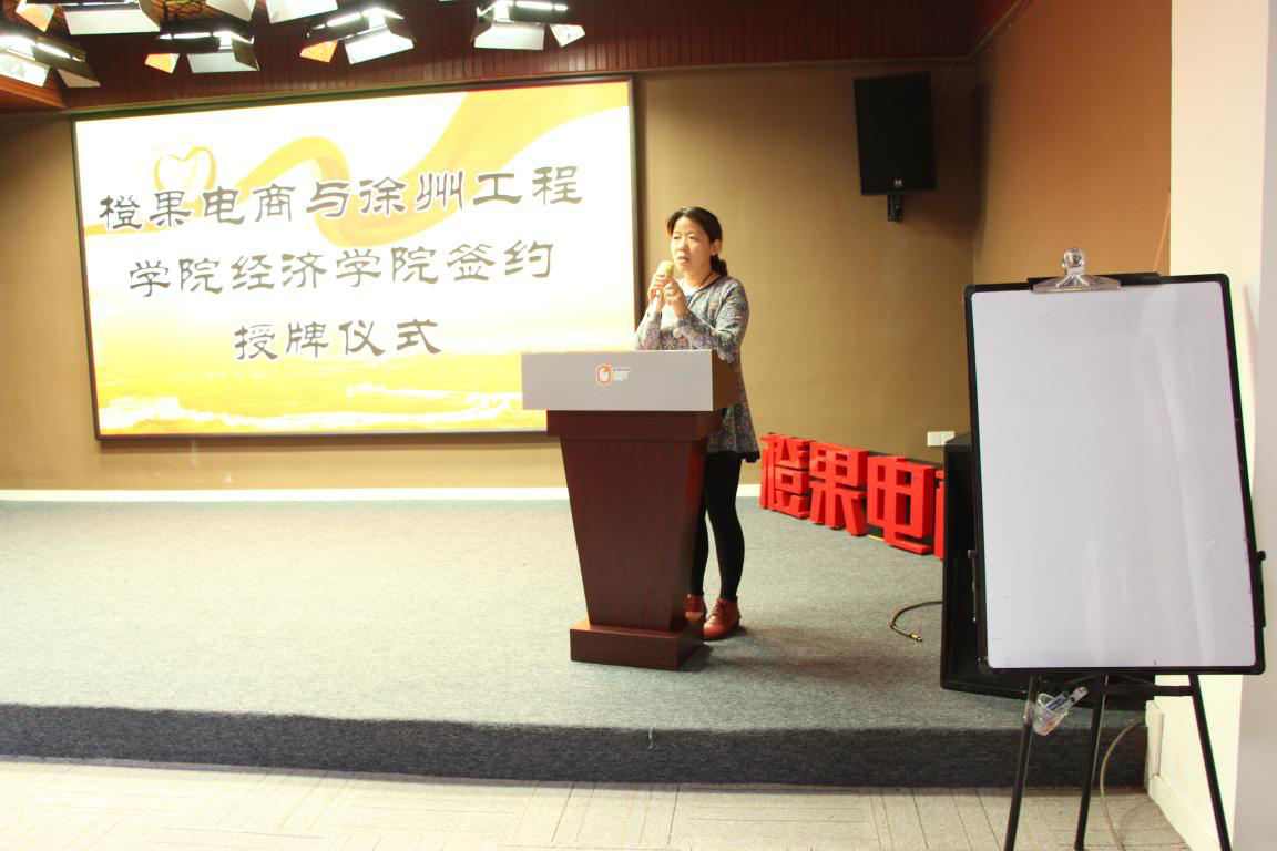仪式上,刘微总经理对徐州工程学院经济学院对橙果的信任和支持表示感谢,表示橙果电商会充分运用现代化网络信息手段,发挥橙果电商的政府、股东、讲师、场地等资源优势,深入开展各种形式的互联网+联合办学活动,实施一站式定向人才培养计划,将院校培养出来的优秀学子通过一系列的培训和引导,使之具备在电商企业上岗工作的基础知识和能力,并通过双选会,让学生与企业面对面沟通交流,双向选择,最终进入企业实习并就业,从而解决当前应届毕业生就业难和电商企业招人用人难的问题,让学生从高起点起步,快速走向工作岗位,迅速融入社会,获得就业和创业更多更好的机会。