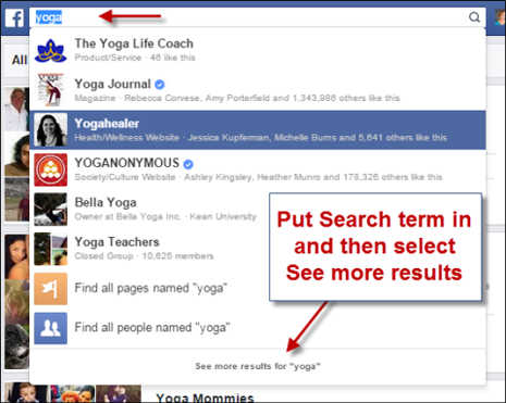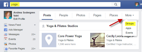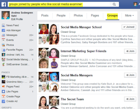 第二种方法:通过Facebook Graph Search搜索目标关键词。在Facebook主页的搜索栏键入目标关键词,然后搜索,在结果页面下拉栏选择More(更多)选项,查看哪个小组是最适合您的,选择加入讨论。