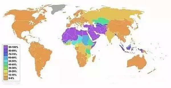 截止到2009年底,世界人口约68亿人口中,穆斯林总人数是15.7亿, 分布在204个国家和地区,占全世界的23%。