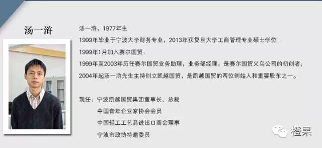 1992年毕业于四川外国语大学 1994年因人才引进从北京来到宁波打工,开始了外贸之路。 2002年成立了宁波市江北意川电器有限公司。 2011年成为微拼车合伙人。 2014年成为悠着点合伙人。 现任:甬乐汇会长和宁波网商联盟会长一职 |