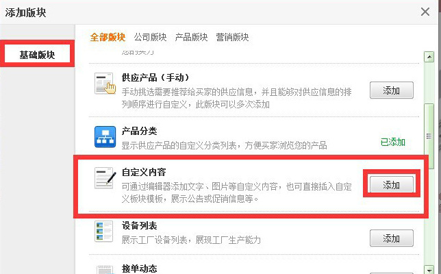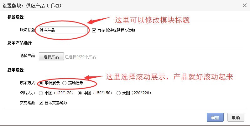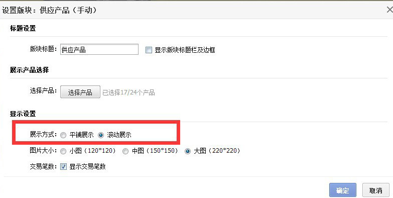 在阿里旺铺其实有一个功能是可以设置产品的轮播效果的,不知道同学们发现了吗?点击新增一个952的供应产品(手动)板块,选择展示方式为滚动展示,如下图: