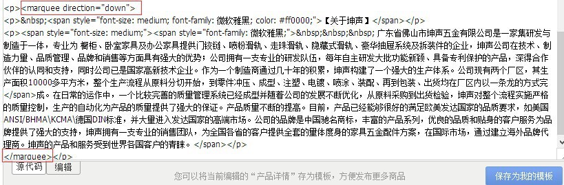 点击确定后就可以发现,原本静静的呆在那里的产品竟然动起来了,好神奇哈。当然用代码也可以实现轮播的效果,只要我们用marquee设定要轮播的图片,同样的效果也是可以实现的。另外一点,图片可以动起来,那么我们文字也是可以动起来的。例如像素素一样,喜欢在自己家产品的详情页面放一些文字,原本就是呆呆的,有时候看着呆呆的公告栏啦,文字说明还真是不爽呀,我们怎样让它动起来呢?我们切换视图编辑为源代码编辑,在你需要动起来的文字的部分,首部跟尾部加入代码:如下图一: