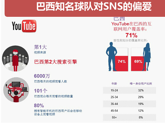 YouTube在巴西是第一大视频来源,第二大搜索引擎,覆盖率高达71%。许多巴西零售商都将YouTube的首页访问者作为目标受众群体,意味着一天内向2400万用户传达你的品牌信息。同时,巴西知名球队对YouTube的参与度也很高,对于巴西这个足球王国来说,是非常具有向导性的。