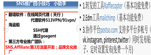 由于目前对Facebook,YouTube等需要翻墙才可以使用,因此这里提供一些小助手给卖家。同时,SNS推广是相当耗费精力的,因此交给第三方专业团队也会有比较好的作用,
