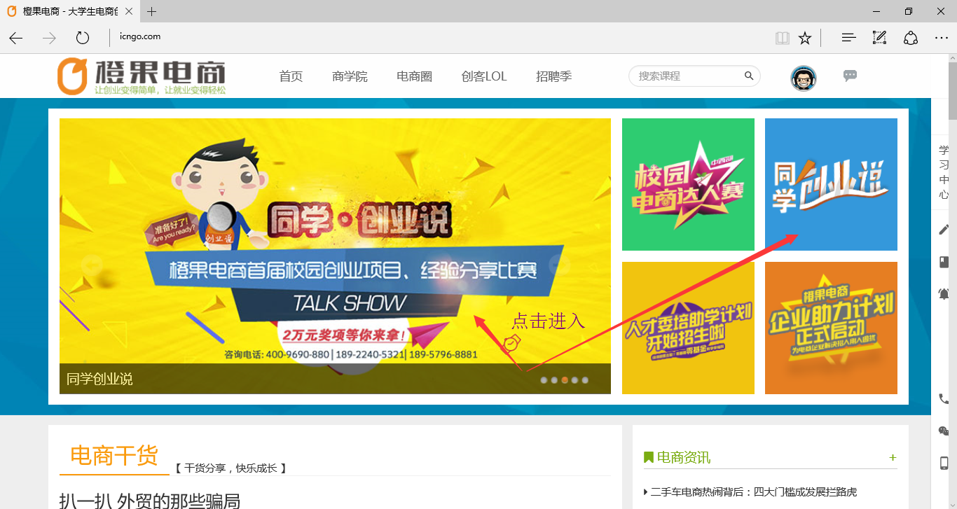 第四步:成功登入账号并进入“同学·创业说”版块